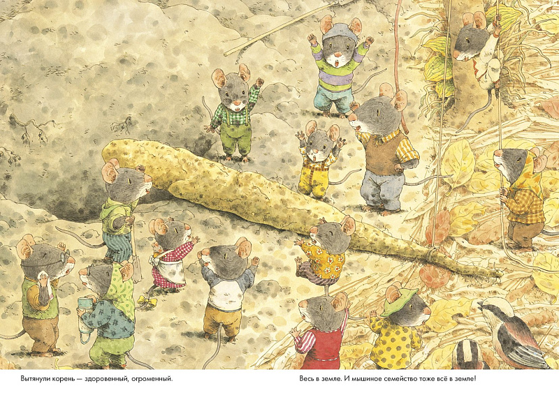 Большое и дружное мышиное семейство Кадзуо Ивамуры на этот раз отправляется копать батат — сладкую картошку. Это не то, что собирать семена или орехи — корень батата тянется глубоко под землёй! Но бабушка и дедушка, мама и папа и десять мышат справятся — все вместе. И, как обычно, подадут пример истинно японского упоения красотой жизни в каждом её моменте.