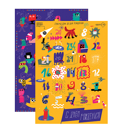 Это адвент-календарь — «Ожидание Дня Рождения — Костюмированная вечеринка».  Считаем дни! Здесь 31 окно на 31 день до праздника. Каждый вечер открывай одно окошко. На обратной стороне окошка — задание/миссия/дело/цель/сверхзадача — называй, как хочешь. Внутри окошка ты найдешь наклейки — маски. Чтобы вечеринка года удалась, надо нарядить в них гостей на плакате. Начинай с окна №31, потом №30 и так дальше — теперь ты твёрдо будешь знать сколько точно дней осталось до главного праздника.