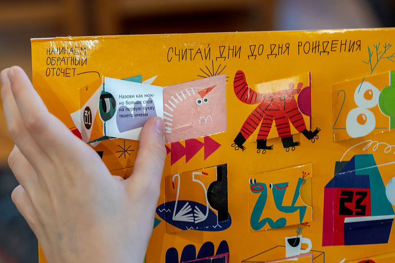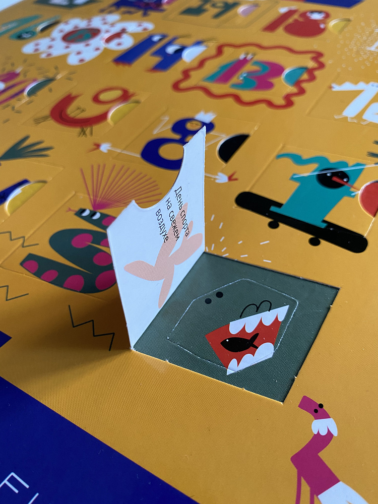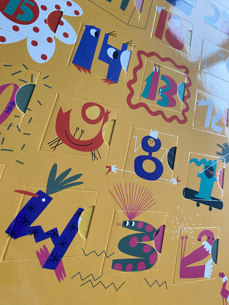 В набор входят адвент-календарь с окошками и плакат для наклеек. В окошках — с оборотной стороны задания, а внутри окошка прячутся наклейки.