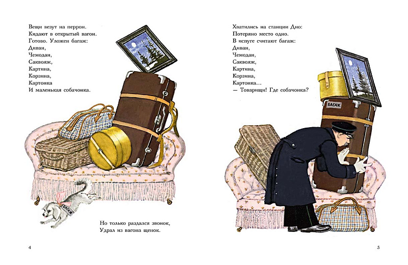 Героиня стихотворения, запасливая дама (барыня), отправляясь в дальнюю поездку, сдала в багаж много разных предметов, а ещё маленькую собачонку. Однако за время пути собачонка внезапно подросла и превратилась в «огромного взъерошенного пса». Поэт весело перечисляет на каждой странице неизменный список вещей: «диван, чемодан, саквояж, картину, корзину, картонку», — как будто колеса поезда ритмично постукивают на стыках и «везут» через всю книжку этот внушительных размеров багаж. А ещё этот перечень очень похож на детскую, моментально запоминающуюся считалку.
