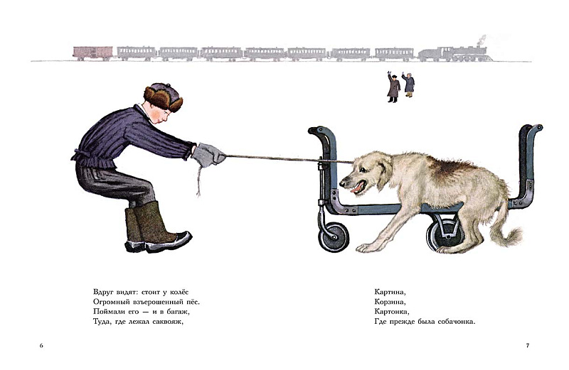 В последнем доработанном издании 1956 г. каждый персонаж представлен подробным портретом: одетая с претензией на моду дама, на пальцах считающий багаж носильщик, усатый железнодорожник, паренек в ватнике и даже собачка с надписью «багаж» на ошейнике. Багаж дамы показан со всех сторон, а багажные тележки нарисованы детально, со всей технической достоверностью.