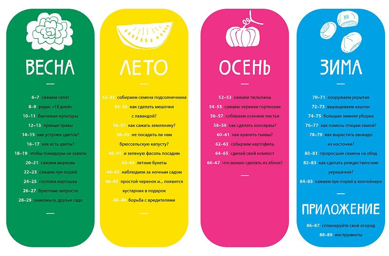 Книга охватывает все 4 сезона – осень, зиму, весну и лето. Будет чем заняться не только в тёплое время года!