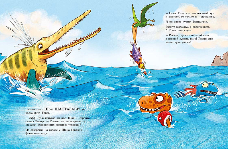 Каждая книга серии «Друзья-динозаврики» рассказывает об одном дне из жизни тираннозаврика Расмуса Рекса и его лучшего друга Трима Троодона. Во второй книге действие происходит на пляже Маленького озера, куда по случаю солнечной погоды пришла позагорать вся семья Рексов. Трим зовет Расмуса купаться, но тому больше нравится лежать на теплом песочке. Тут появляется старший братец Расмуса Робин и, как обычно, начинает задираться и дразниться. А потом предлагает Расмусу и Триму устроить заплыв до острова и обратно. Вся эта затея не сулит Расмусу ничего хорошего: сказать по правде, плавает он неважно, да еще эти слухи о морском чудовище, которое якобы видели в озере. Скрепя сердце он принимает вызов, только чтобы доказать противному братцу, что никакой он не трус. Никто не сомневается, что победит Робин — он всегда выигрывает. Однако совершенно неожиданно у Расмуса находится защитник, и Робин получает хороший урок.