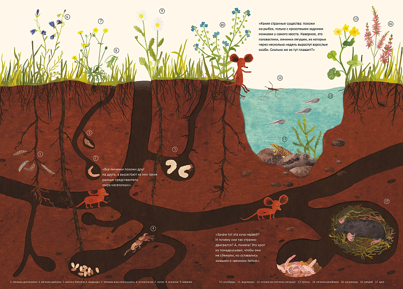 Отправляйся в путешествие по большому и маленькому миру вместе с Мышкой: изучи подземных жителей, собери гербарий, попробуй приманить насекомых на кусочек сырого мяса, загляни внутрь муравейника, научись различать трели птиц, ловить головастиков и выращивать петрушку.