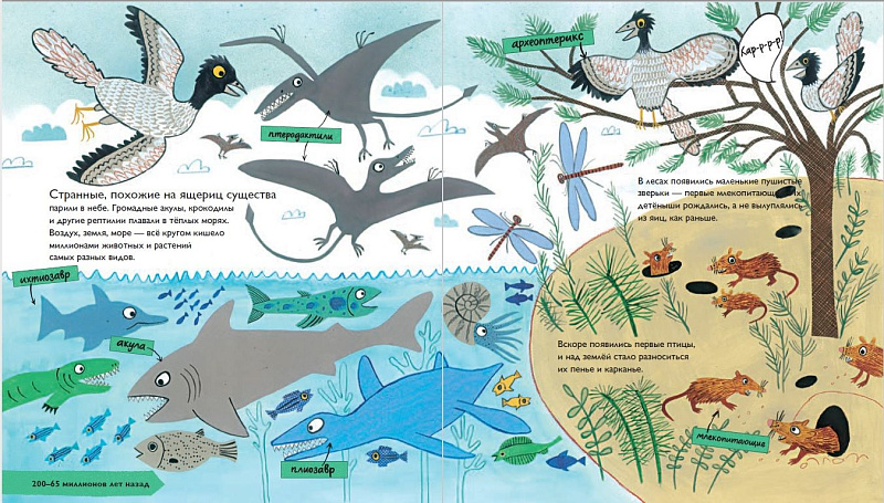 Об истории жизни на нашей планете интересно и понятно для дошкольников рассказывают эколог Кэтрин Барр и биолог Стив Уильямс с помощью прекрасных динамичных иллюстраций Эйми Хасбанд. Извержения вулканов, жизнь простейших организмов, динозавры и эволюция человека – события, о которых рассказывается в книге, заняли 4 миллиарда лет и несколько десятков увлекательных страниц.
