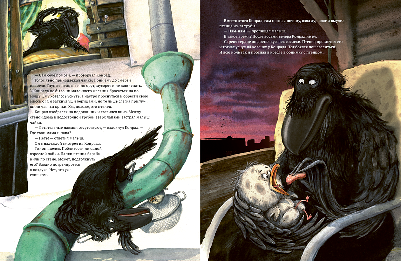 На крыше маленького домика посреди Стокгольма живет ворон Конрад. По вечерам он жарит сосиски на огне или спит в кресле, уткнувшись клювом в книгу. Но однажды тишину нарушают крики о помощи: только этого не хватало, птенец чайки выпал из гнезда и потерялся! Конрад не любит чаек, он хочет как можно скорее найти родителей и избавиться от вечно голодного птенчика. Но это не так уж и просто, дело принимает детективный оборот!