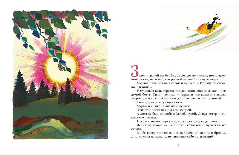 В познавательной сказке замечательного русского писателя-анималиста Виталия Бианки говорится о любопытном муравье, который забрался на дерево да и улетел с порывом ветра на березовом листочке далеко от муравейника. Ему надо добраться домой до захода солнца, иначе он не сможет попасть внутрь.