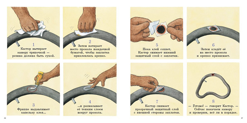 Кастор показывает Фриппе, как правильно снять колесо, найти прокол и поставить заплатку. Объясняет, что велосипедная шина состоит из покрышки и камеры, показывает, как пользоваться монтажками и как не растерять мелкие детали в процессе ремонта. Оказывается, чинить шину так увлекательно! И совсем не сложно.