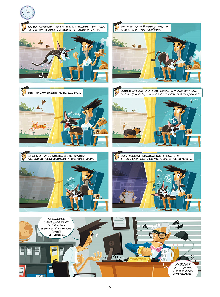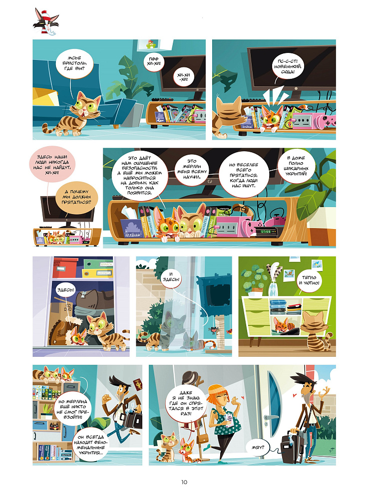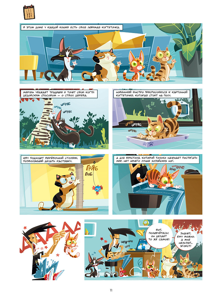 Второй том «Кошек в комиксах» встречает нас уже знакомыми лицами… хотя, правильнее сказать, мордочками.<br> Рыжий котёнок Бристоль продолжает набираться опыта, но теперь он уже не так наивен и порой разбирается в ситуации быстрее старины Мерлина. Вдобавок, в новом томе авторы предоставили ему возможность самому сыграть роль учителя для неожиданного гостя — кота на передержке.<br> <br> Изнеженная кошка Юзу всё так же (без)успешно борется с лишним весом… то есть — пардон! — с чрезмерной пушистостью. Впрочем, борются скорее её хозяева, предлагая ей навороченные интерактивные кормушки и лазалки для повышения активности. Все эти препоны Юзу с лёгкостью обходит, пребывая в полном согласии с собой.<br> <br> «А как же Мерлин?» — спросите вы. Что ж, бывший уличный кот по-прежнему сыплет научными фактами и делится премудростями. Несмотря на преклонный возраст, он сохранил в запасе несколько трюков, один из которых — феноменальное искусство прятаться! Ворчливость и дикие повадки матёрого кота никуда не делись, но век технологий настиг и его… Как? Об этом вы узнаете, прочитав второй том серии «Кошки в комиксах»!<br> <br> Структура книги осталась прежней: короткие одностраничные истории из повседневной жизни порадуют забавными ситуациями, а поясняющая тетрадь в конце тома предоставит полезную информацию по содержанию пушистых мяукающих питомцев.