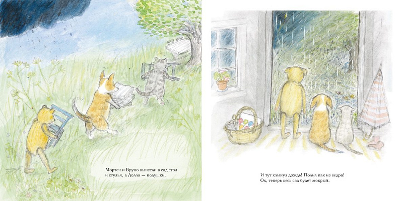 Мишка Бруно и его собака Лолла – герои 4-х книжек-картинок, созданных современной шведской художницей Гуниллой Ингвес. Каждая книга посвящена одному из времен года – зиме, весне, лету и осени – и в ней описывается один день из жизни героев, наполненный занятиями и развлечениями «по сезону».<br> <br> В книге «Лето мишки Бруно» мишка с собакой с утра трудятся в огороде: пропалывают, поливают, удобряют грядки, косят траву. После работы они идут на речку, купаются, наблюдают за водомерками и жуками-плавунцами, потом собирают в лесу малину и даже находят на тропинке змеиную кожу. А вечером друзья принимают гостей и накрывают стол в саду.<br> <br> Главную историю книги «обрамляют» записки из дневника наблюдений Мишки Бруно. В них содержится множество зарисовок и познавательных сведений из мира окружающей природы определенного времени года.<br> <br> Первый дневниковый разворот «Лета мишки Бруно» посвящен садоводству: как правильно приготовить удобрение из крапивы, где именно лучше косить траву и зачем нужны дождевые черви. Второй разворот посвящен перелетным птицам, насекомым и рептилиям, которых можно встретить летом в нашей полосе.<br> <br> Книги из серии о мишек Бруно можно назвать практической энциклопедией времен года для детей 3-6 лет. С нежными иллюстрациями пастельных тонов, множеством деталей для рассматривания на каждой странице и обаятельными главными героями.<br>