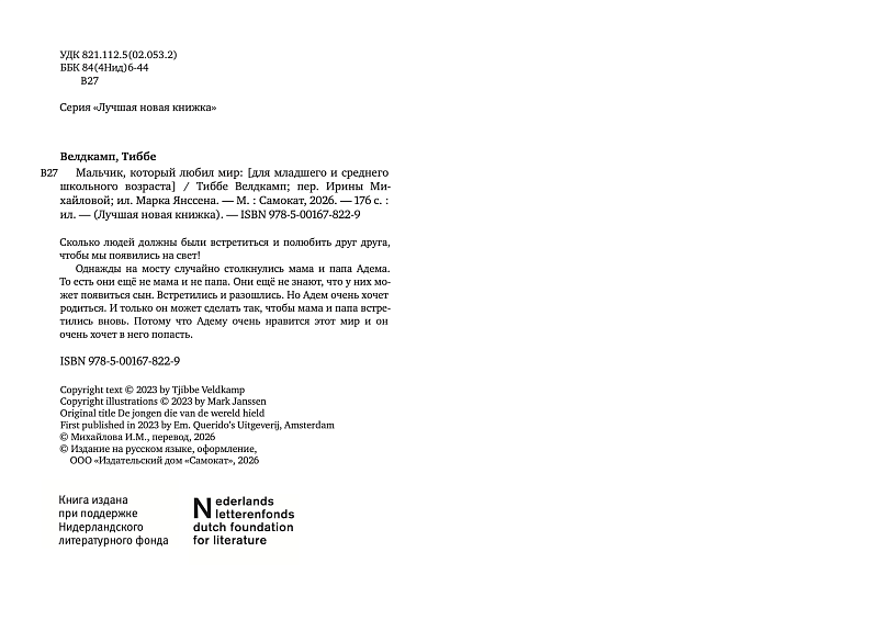 <p> Сколько людей должны были встретиться и полюбить друг друга, чтобы мы появились на свет! </p> <p> Однажды на мосту случайно столкнулись мама и папа Адема. То есть они ещё не мама и не папа. Они ещё не знают, что у них может появиться сын. Встретились и разошлись. Но Адем очень хочет родиться. И только он может сделать так, чтобы мама и папа встретились вновь. Потому что ему очень нравится этот мир и он очень хочет в него попасть. </p> <h2>5 причин купить книгу «Мальчик, который любил мир»:</h2> <ul> <li> <p> То ли быль, то ли сказка. И для детей, и для взрослых; </p> </li> <li> <p> Для тех, кто привык сам творить свою судьбу; </p> </li> <li> <p> О том, что любовь всегда побеждает; </p> </li> <li> <p> О том, что никогда не стоит отчаиваться; </p> </li> <li> <p> Иллюстрации одного из самых известных голландских художников и любимого иллюстратора «Самоката» – Марка Янссена. </p> </li> </ul>
