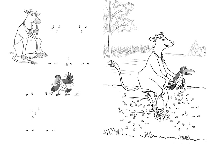 Мама Му и Кракс катаются на велосипеде, лазают по деревьям и ловят рыбу. Кто же там плавает в воде? И о чём мечтает Кракс? Соедини точки, и увидишь спрятанный рисунок.