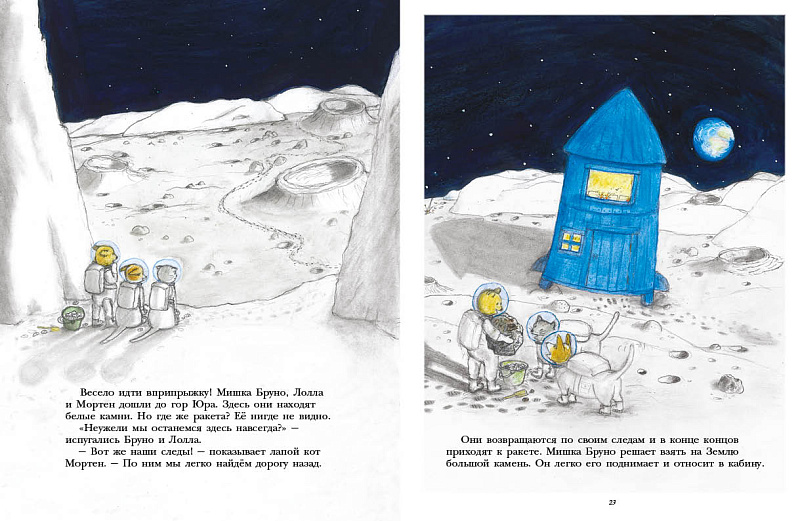 В конце книги читателя ждет особая познавательная часть — «Записки мишки Бруно». Там есть карта Луны, сведения о ее размерах и географии, а также доступное объяснение того, что такое сила земного притяжения и почему Луна видна нам то целиком, то лишь наполовину, а то и вовсе не видна.