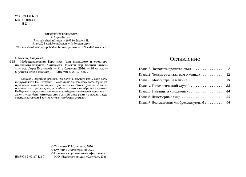<p> Однажды Вероника решила, что должна выучить как можно больше ругательств. Но — странно — маме это не понравилось. Тогда Вероника придумала коллекционировать умные слова. Однако умные слова запоминаются гораздо хуже, и вообще с ними сам чёрт ногу сломит. Но Вероника не унывает, в её мире каждый день что-то происходит, и, кто знает, может быть, однажды они с семьёй даже рванут в Африку, ведь жизнь, как говорит Вероника, такая «небредсказуемая». </p> <h2>5 причин купить книгу «Небредсказуемая Вероника»:</h2> <ul> <li> <p> Смешная и глубокая история для читателей любого возраста про трудности освоения «взрослого» языка и не только; </p> </li> <li> <p> Про жизнь обычной семьи, которая не менее интересна, чем любые приключения; </p> </li> <li> <p> Для тех, кто ладит с животными лучше, чем с людьми; </p> </li> <li> <p> Атмосферные и динамичные иллюстрации Леры Елуниной; </p> </li> <li> <p> Итальянская классика детской литературы от лауреата премии Андерсена, одной из любимых писательниц «Самоката» – Анджелы Нанетти. </p> </li> </ul> <p> <b>ЦИТАТЫ ИЗ КНИГИ:</b> </p> <i>«У Валентины сейчас непростой период… Уф!!! Если это и значит «становиться барышней», то мне уже перехотелось!»</i> <p> </p> <i>«Теперь Валентина говорит, что у нас в доме диктатура и что, как только ей исполнится восемнадцать, она уйдёт из дома c Ганнибалом и будет петь в его группе. Надеюсь, она не передумает».</i> <p> </p> <i>«Через некоторое время всякие нехорошие слова стали вырываться у меня изо рта непроизвольно, сами собой. Я собиралась их только подумать, и вдруг — хоп! — они снаружи».</i> <p> </p> <i>«Я-то сама больше не ругаюсь, но поскольку Роберта — моя подруга, я решила одолжить ей немного плохих слов, она-то почти никаких не знает, потому что у неё четыре старшие сестры и родители, которые больше похожи на бабушку и дедушку».</i>