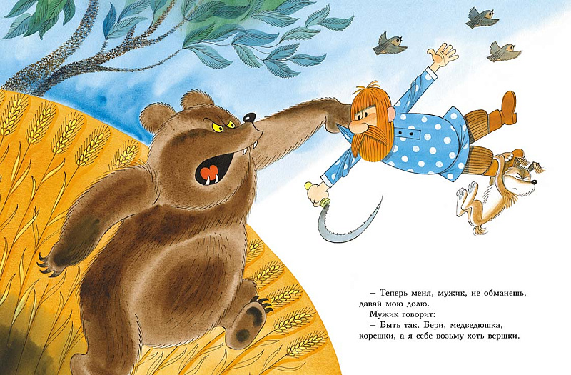 Первая – это известная русская народная сказка «Мужик и медведь» в пересказе А.Н. Толстого. Мужик был работящим, сеял то репу, то рожь, а медведь бездельничал, но каждый раз надеялся урвать часть урожая, выращенного мужиком. Медведь сильный, но глупый. Мужик послабее, но умный. Ум в этой сказке побеждает силу. Так и в жизни бывает.