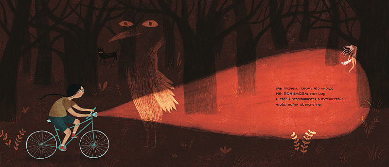 Мало кто знает, но я также большая собирательница страхов. У меня есть красный страх, яркий, как свежая кровь; есть другой — огромный, тёмный и вязкий; есть у меня и страх крохотный, как зёрнышко риса; и даже страх, который умеет свистеть. Один раз меня посетил страх, как две капли воды похожий на меня, только с огромными глазами. А ещё у меня был страх в форме чёрного яйца, тяжёлого и хрупкого, похожего на то, которое я нарисовала для этой истории.