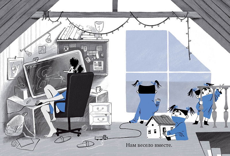 Текст появился в конце, внезапно, как эксперимент – «а что если?». Он неожиданно лёг сверху, усилил визуальный ряд и добавил многослойности, интриги, игры. Мне нравится, что история автономна и без текста, и самый маленький в ней увидит гораздо больше, чем тот, кто уже умеет читать.