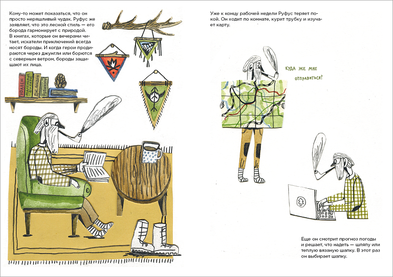 Руфус живет в городе, но его борода пахнет хвоей, дымом костра и ежевичным чаем. Каждую неделю он ждет не дождется выходных, чтобы отправиться на природу. Он точно знает, что нужно взять с собой в поход, и очень не любит тех, кто оставляет мусор в лесу.