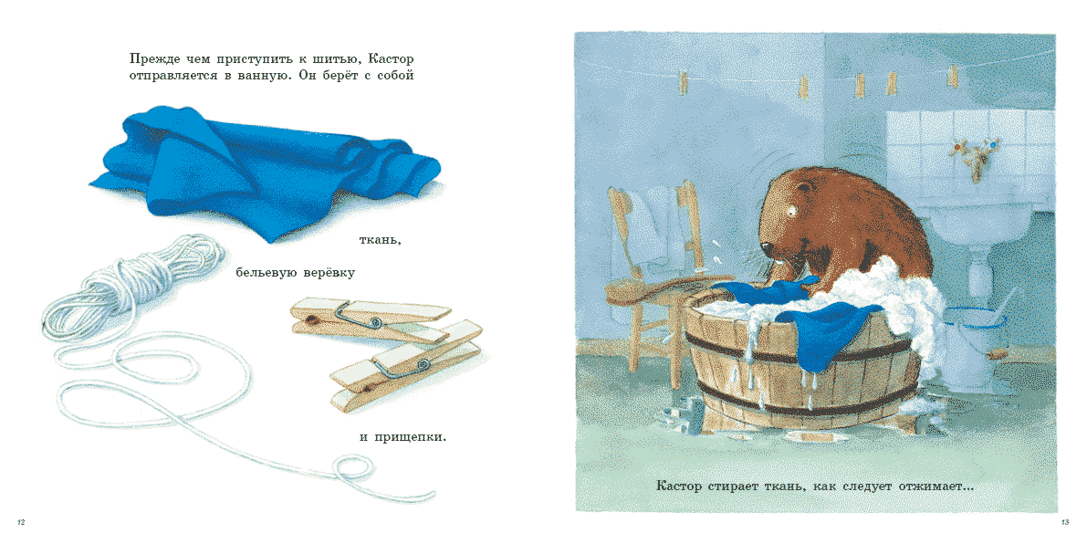 Старый рабочий фартук Кастора совсем прохудился, и он решает смастерить себе новый. Кастор приступает к делу со всей свойственной ему обстоятельностью: выбирает ткань, готовит ее к раскройке, чертит выкройку на бумаге, переносит ее на ткань, аккуратно вырезает, затем приметывает детали, подгибая края, и, наконец, прострачивает на швейной машинке. Всё очень просто! Тем более, что каждый шаг подробно проиллюстрирован, а в конце прилагается нужная выкройка. Словом, с такой книгой трудно удержаться, чтобы не попробовать себя в роли портного.