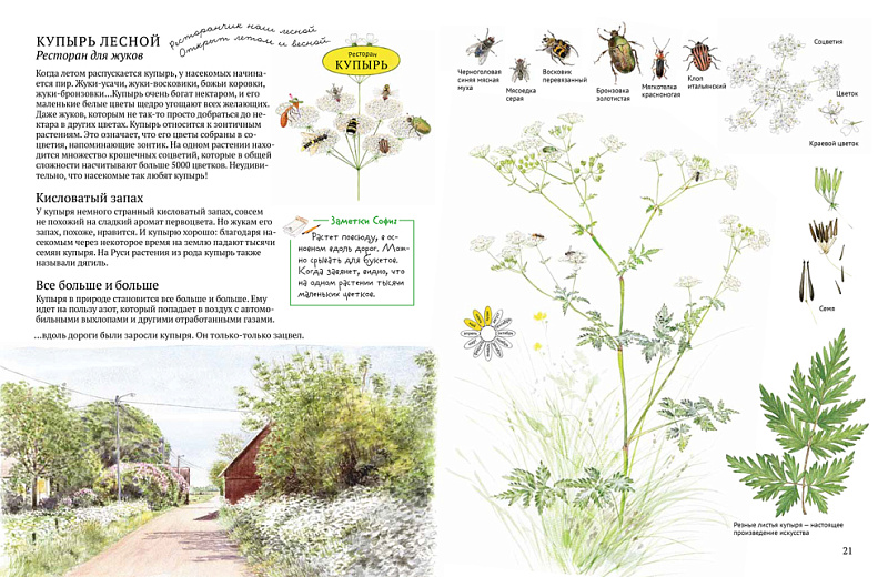 Муравьишка Софи приглашает тебя в путешествие по миру цветов. Как живут цветы? Каких насекомых привлекают? Существуют ли цветы, которые едят насекомых? Это лишь некоторые из вопросов, на которые Софи попытается найти ответы. Ее исследование начинается ранней весной. Вместе с Софи читатель отправится к двадцати дикорастущим растениям. Каждое из них нарисовал мастер ботанической иллюстрации, в окружении насекомых, с которыми этот цветок взаимодействует в течение своей жизни. Следуй за Софи, и ты узнаешь, как определять время по кувшинке, зачем венерин башмачок ловит пчел и почему купырь обожает выхлопные газы.