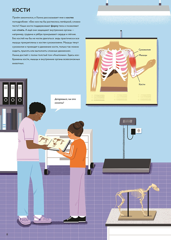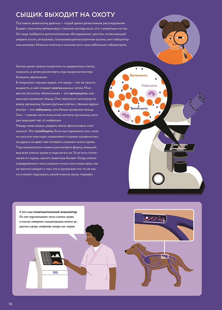Приглашаем вас пройти недельную практику в настоящей ветеринарной клинике вместе с главной героиней книги: девочкой Ильви, мечтающей в будущем стать ветеринаром и лечить животных! Вместе с ней вы не только побываете на приёме мелких зверей и рептилий, в рентгеновском кабинете, операционной, лаборатории и объездите все фермы в округе, но и узнаете много нового и интересного о зубах и костях, о работе пищеварения и сердца, о том, какие витамины и минеральные вещества нужны домашним питомцам и животным на ферме. Вас также ждут задания, вопросы и полезные советы, как заботиться о зверях и птицах: домашних, диких и экзотических.