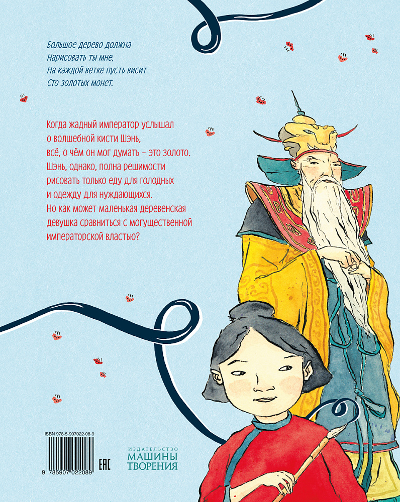 "Большое дерево должна<br> Нарисовать ты мне,<br> На каждой ветке пусть висит<br> Сто золотых монет".<br> Когда жадный император услышал о волшебной кисти Шэнь, все, о чем он мог думать - это золото.<br> Шэнь, однако, полна решимости рисовать только еду для голодных и одежду для нуждающихся. Но как может маленькая деревенская девушка сравниться с могущественной императорской властью?<br>