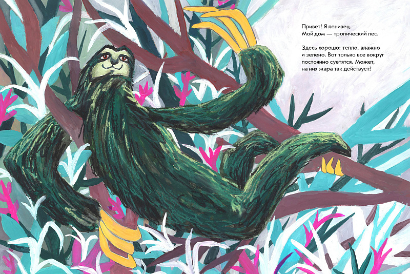 Привет. Я ленивец. Я не ленивый, хотя меня часто называют медленным. Вообще, это правда. Кажется, что все вокруг меня быстрее: колпицы подгоняют, крокодилы зовут посоревноваться, муравьед — поохотиться на муравьёв, а туканы — отбить с ними бит. Но мне это не очень подходит. Я лучше спокойно посижу на дереве, полюбуюсь на небо, и послушаю музыку потише. Это же не значит, что я плохой или какой-то неправильный. Просто я такой.