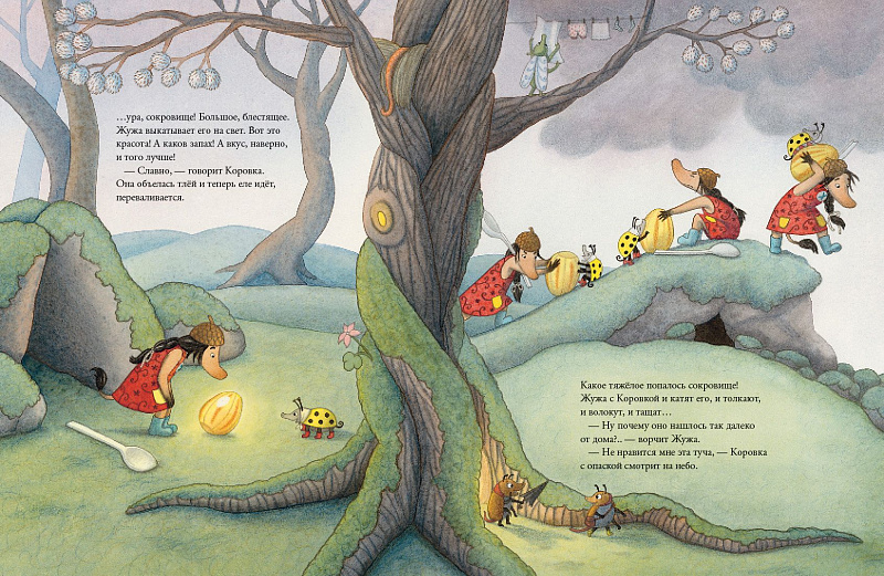 Собралась уже целая компания искателей сокровищ: Жужа с Коровкой, червяк с мокрицей, землеройки, жаба, крот... Чем дело кончится, отыщется потерянное сокровище или нет — увидим. Зато приключений точно хватит на всех!
